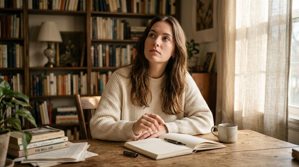 Femme assise à un bureau avec des livres et un cahier ouvert