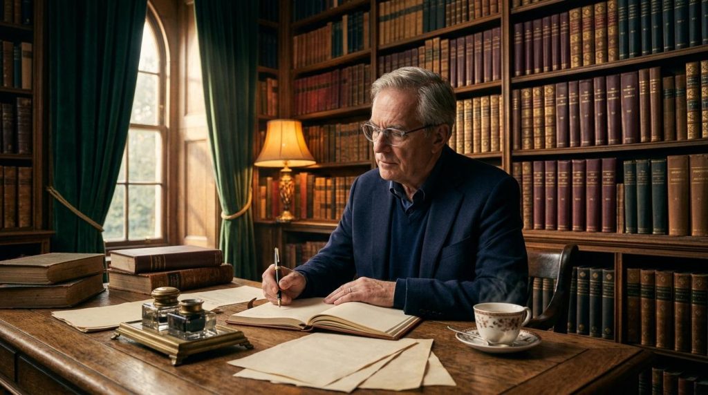 Homme âgé écrivant à son bureau dans une bibliothèque historique