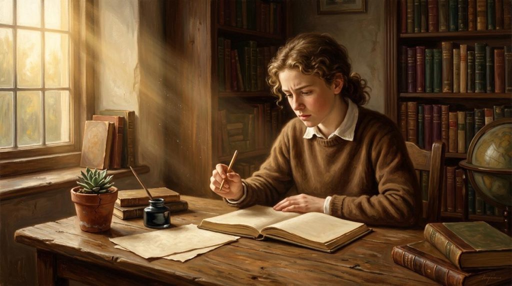 Jeune femme écrivant à son bureau en bibliothèque historique