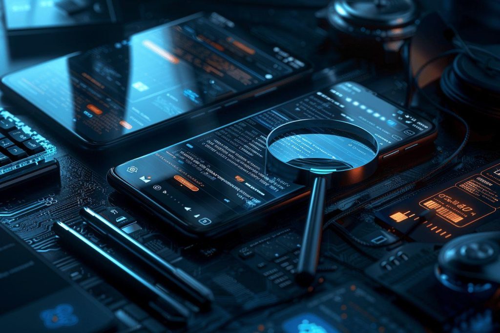 Smartphone, circuit électronique et loupe sur fond sombre et lumineux