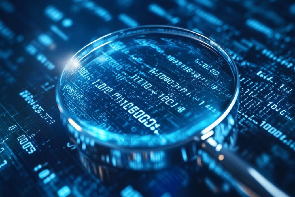 Loupe grossissant des codes binaires bleus sur fond technologique